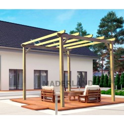 Pergola autoportante in legno massello Madrid 3x3m 9m2.La pergola Madrid in legno massello autoportante per godere di un'estensione del giardino e della terrazza ti permette di modulare la luce e il sole con una copertura a tua scelta.
