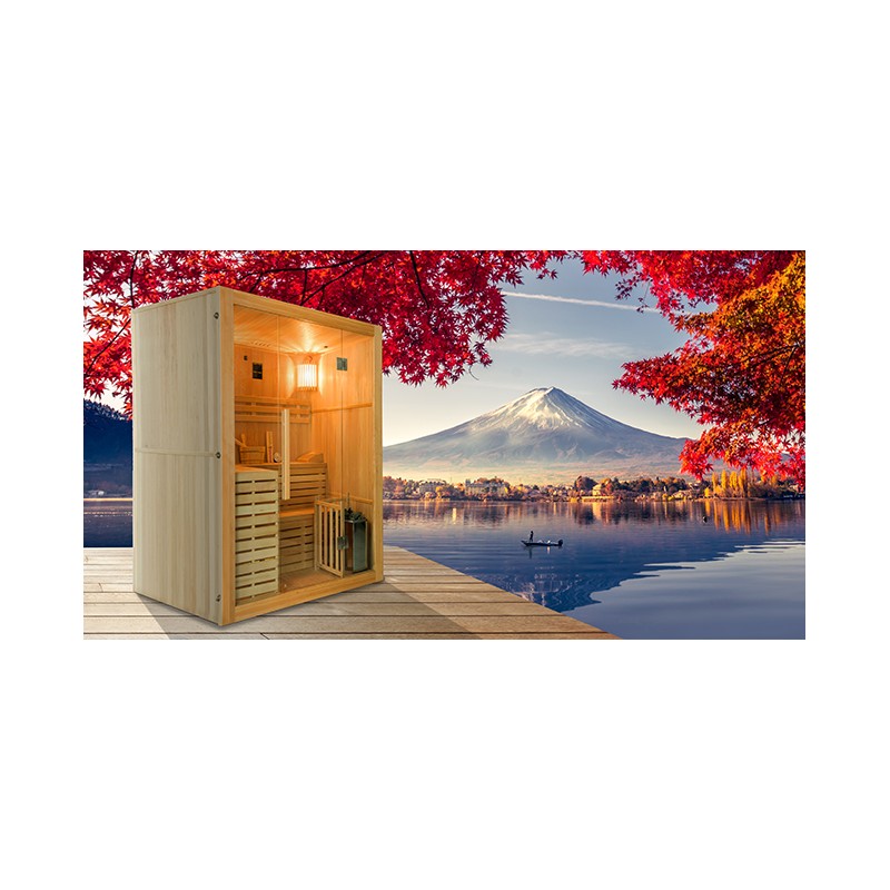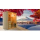Die Sense-Kabine wird mit vielen traditionellen Geräten geliefert: gedämpfte Leuchten, Pfannenschutz, ergonomische Rückenlehne, Kopfstütze und komplettes Zubehör-Set (Eimer, Zwielichter, Thermometer, Hygrometer, Sanduhr).