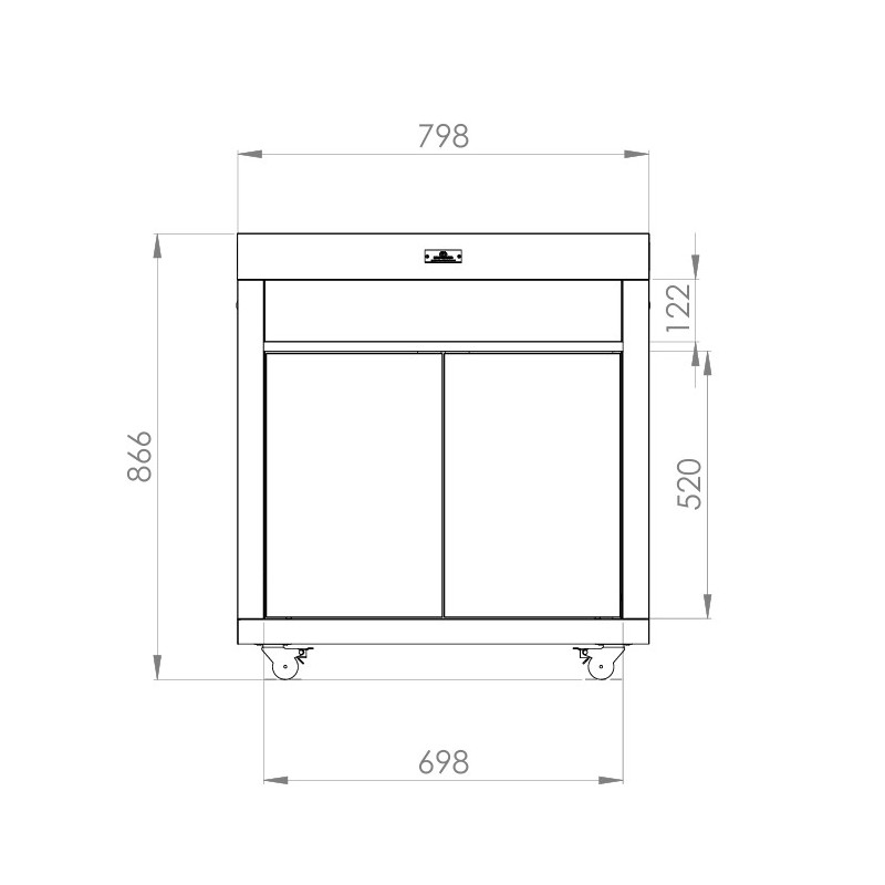 Das Außenküchenschrank aus galvanisch verzinktem Stahl mit Epoxidfarbe ist für die Platzierung einer Plancha oder eines Grills konzipiert Der Torschütze oben auf der Platte Maße: B 80 x T 55 cm.