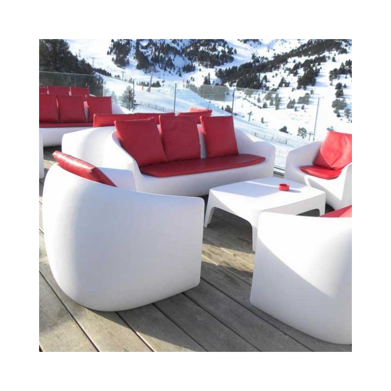 Gartenmöbel Blow by Vondom bestehend aus einem Sofa, einem Sessel und einem ultramodernen Couchtisch für drinnen und draußen.