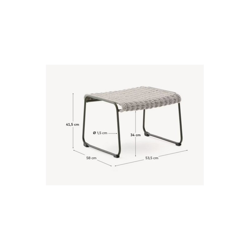 Fußstütze aus verzinktem Stahl mit Sitz und Rückenlehne in Ecrugrau, handgeflochtenes und UV-beständiges Seil. Geeignet für den Außenbereich. Sitzhöhe 41,5 cm.