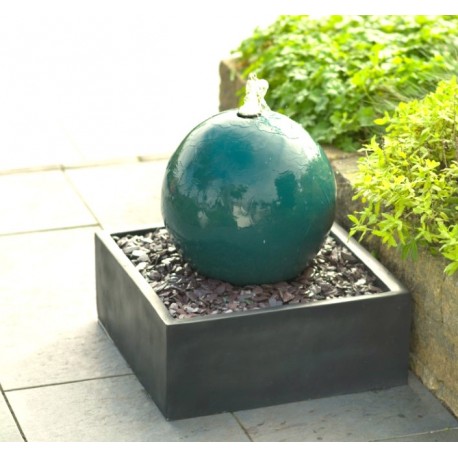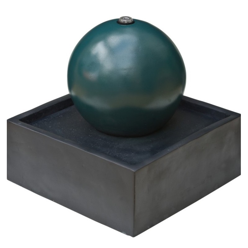 Das Licht, das Wasser und die glänzende Oberfläche der petrolfarbenen Kugel machen den Charme dieses Wasserspiels mit seinem schlichten Design aus.