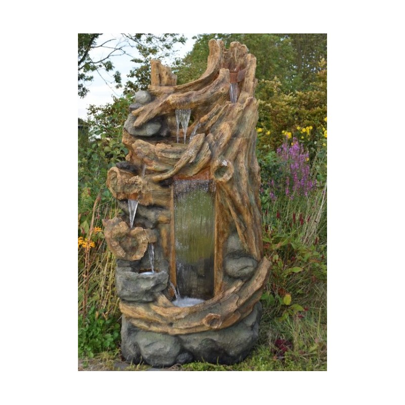 Der Sartène Ubbink-Brunnen, ein majestätischer Wasserfall, der die natürliche Form alter Baumstämme nachahmt. Die Wasserfälle bilden sich auf Höhe der Becken und werden von LEDs beleuchtet. Komplett mit Pumpe für den Garten einsatzbereit