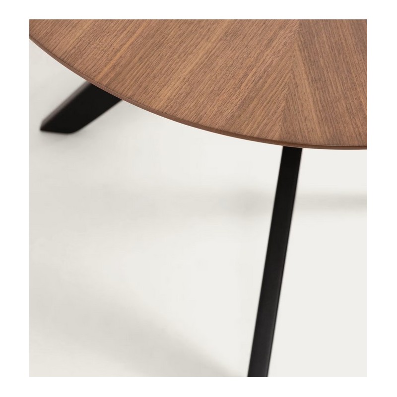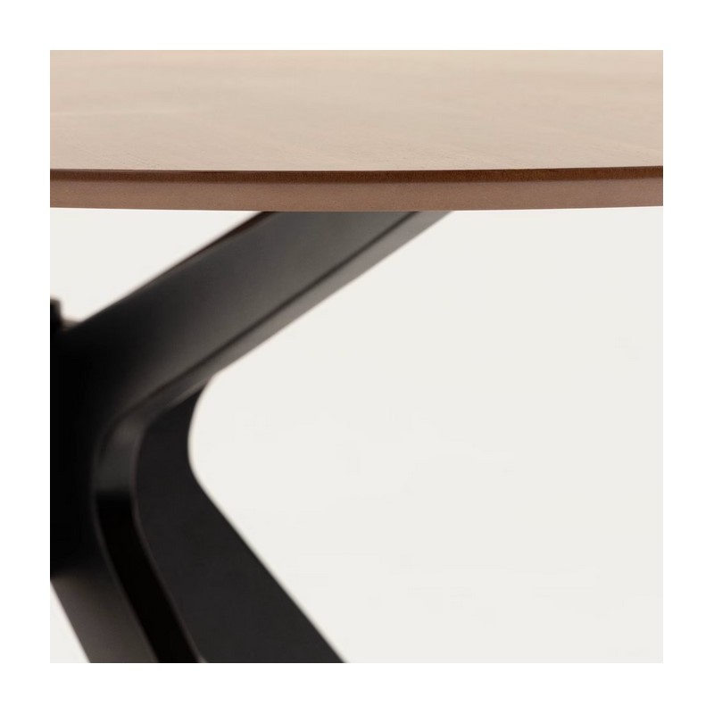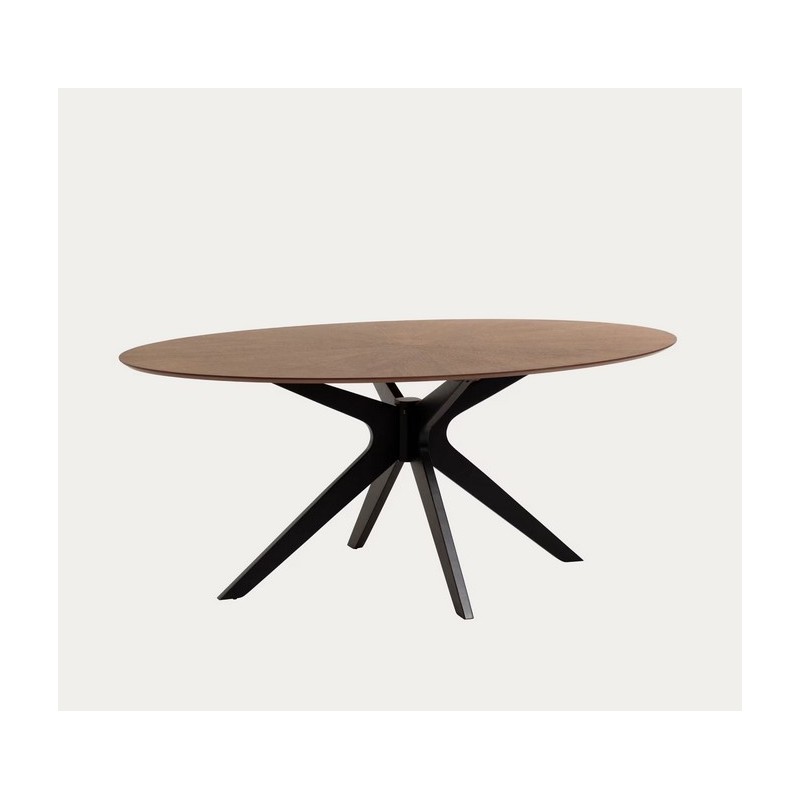 Ovaler Tisch mit Platte aus MDF-Furnier, Nussbaumfurnier. Beine aus schwarz gebeiztem Gummiholz.