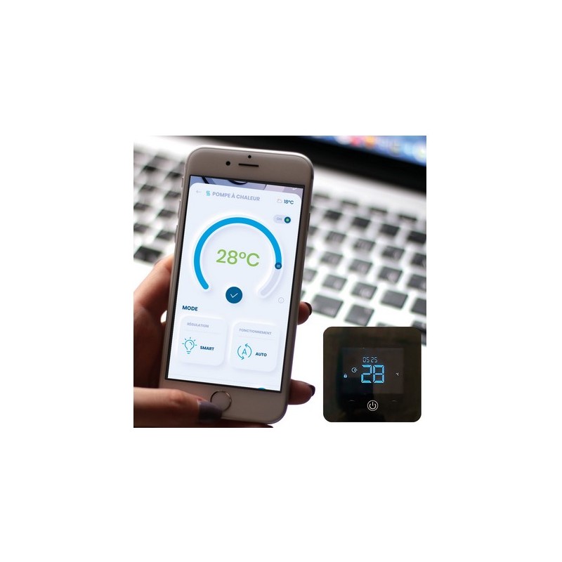 Die Hoch- und Niederdruckregler, die Wassermangelsicherung (Durchflusswächter), das Abtausystem mit Zyklusumkehr und die 5 Temperaturfühler werden von einem digitalen Regler gesteuert, der einen optimalen Schutz der Wärmepumpe und eine präzise Regelung der Pooltemperatur gewährleistet.