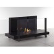 The fireplace has a horizontal plane painted steel (high temperature, black), painted steel legs, and 2 facades in tempered glass (type safety, high temperature), 1 black reflective and transparent 1.