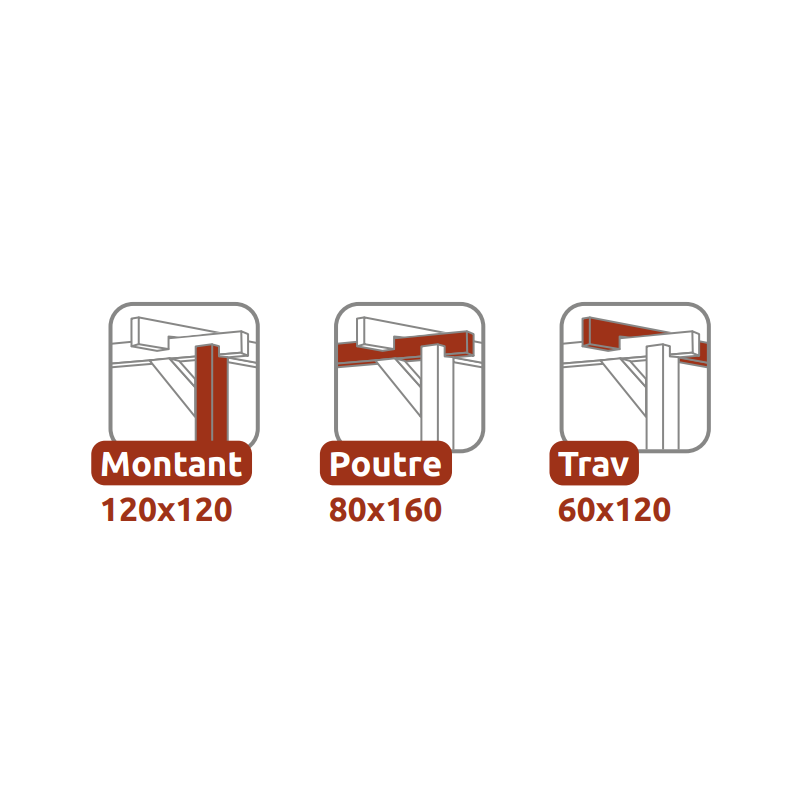 The structure of this carport is composed of 6 upright posts with a cross-section of 12 x 12 cm, load-bearing beams with a cross-section of 8 x 16 cm and crossbeams with a cross-section of 6 x 12 cm.
