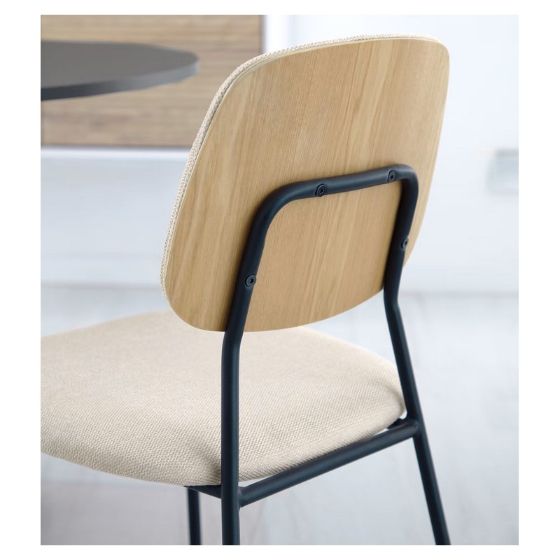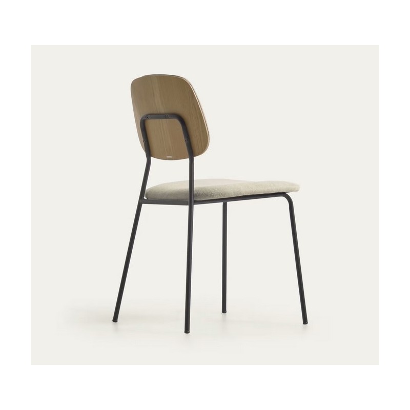 The trendy Linda chair is characterized by its retro style with its design and materials. The combination of oak veneer and black steel is complemented by the beige chenille fabric.