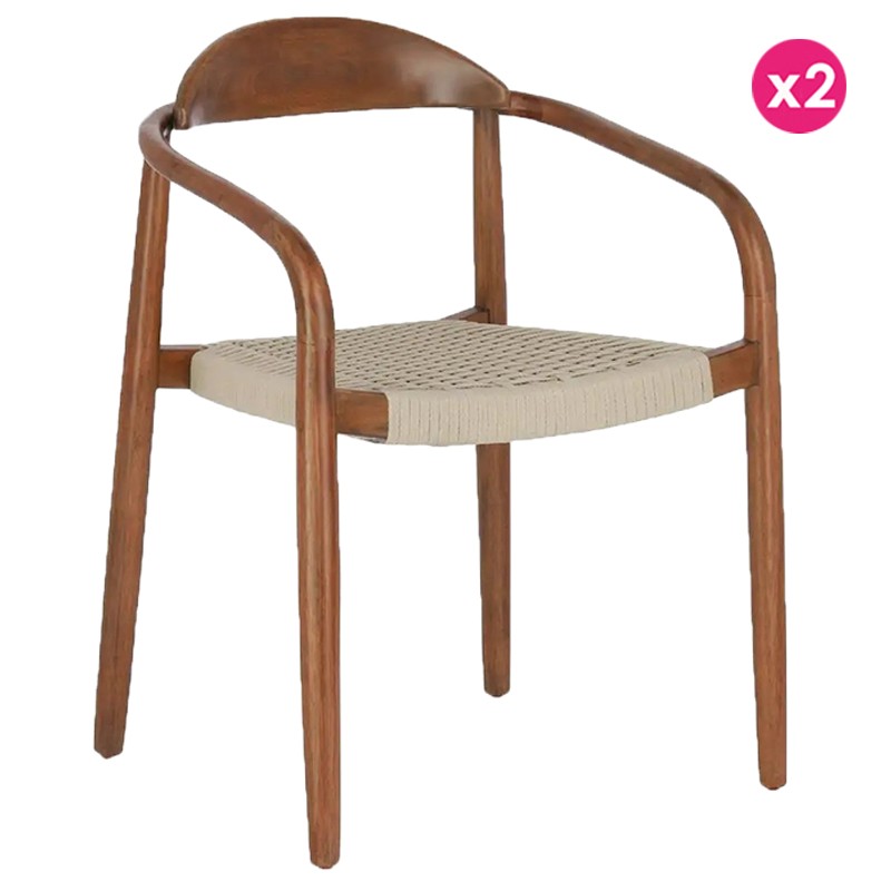Set of 2 Chairs with armrest Accacia solid finish Walnut and Beige Rope KosyForm.