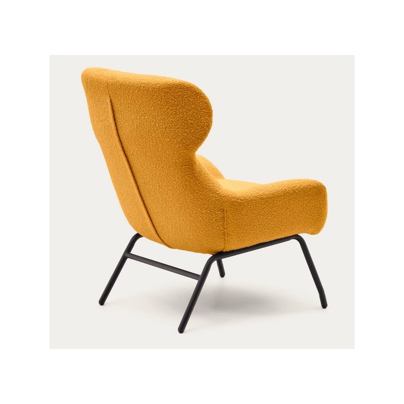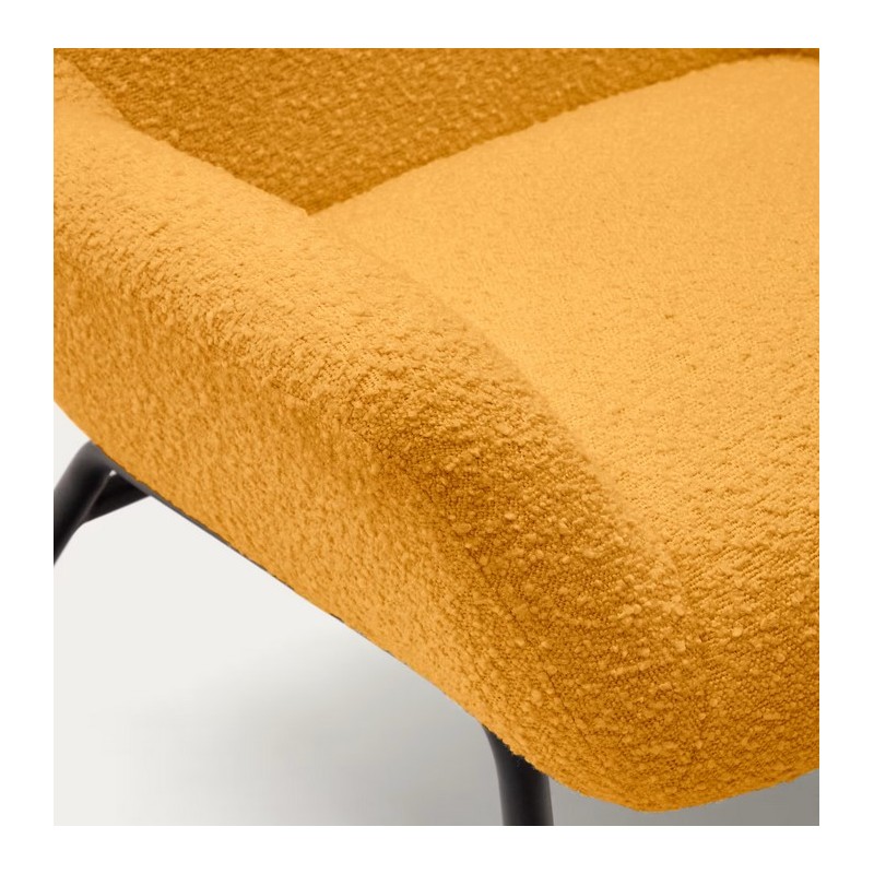 The Lina armchair with armrests in yellow mustard terry fabric and steel legs plural of noir.