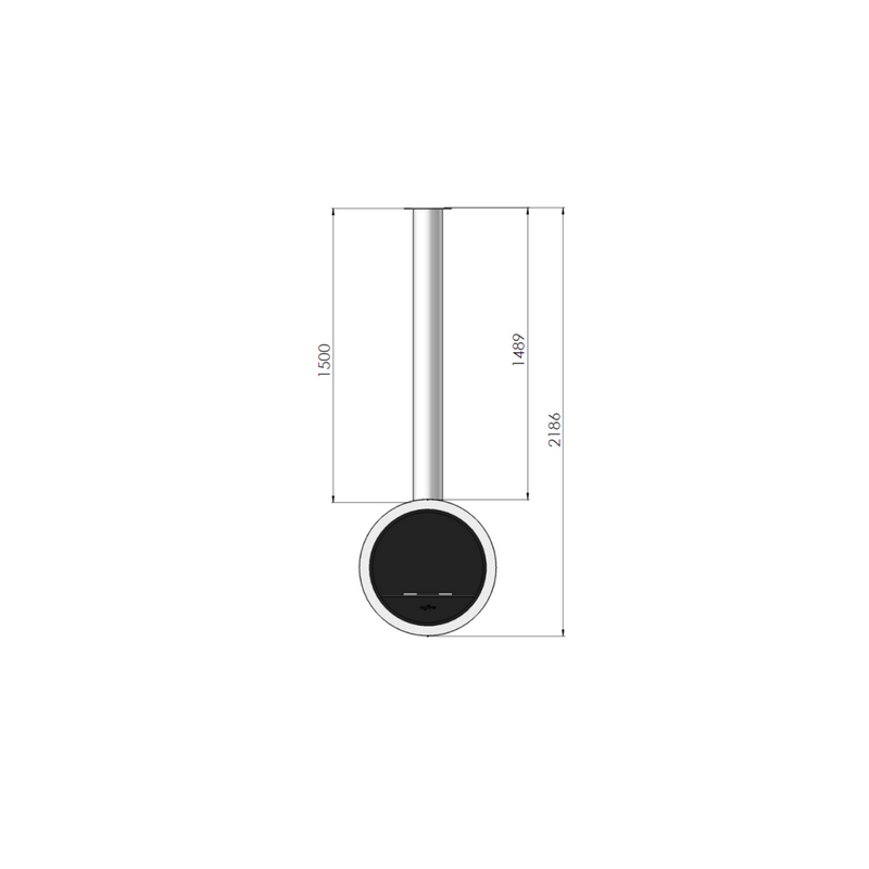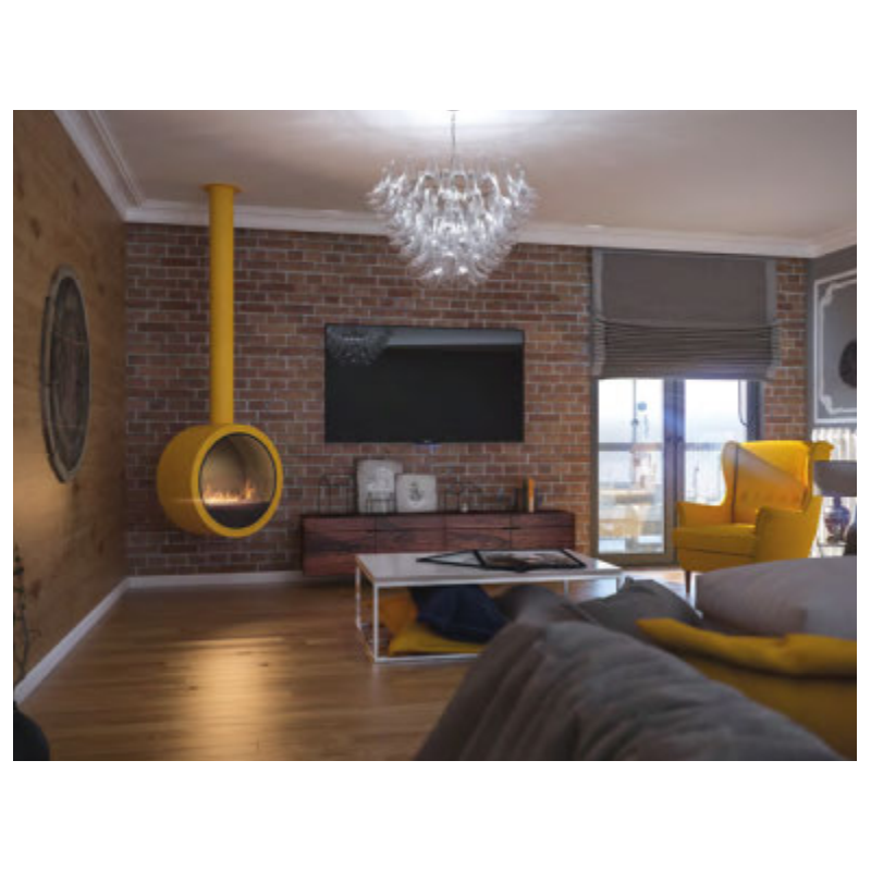 The Bioethanol Fireplace Incyrcle With 1 pane of glass is to be hung on the ceiling with its round tube but can also be placed against a wall.