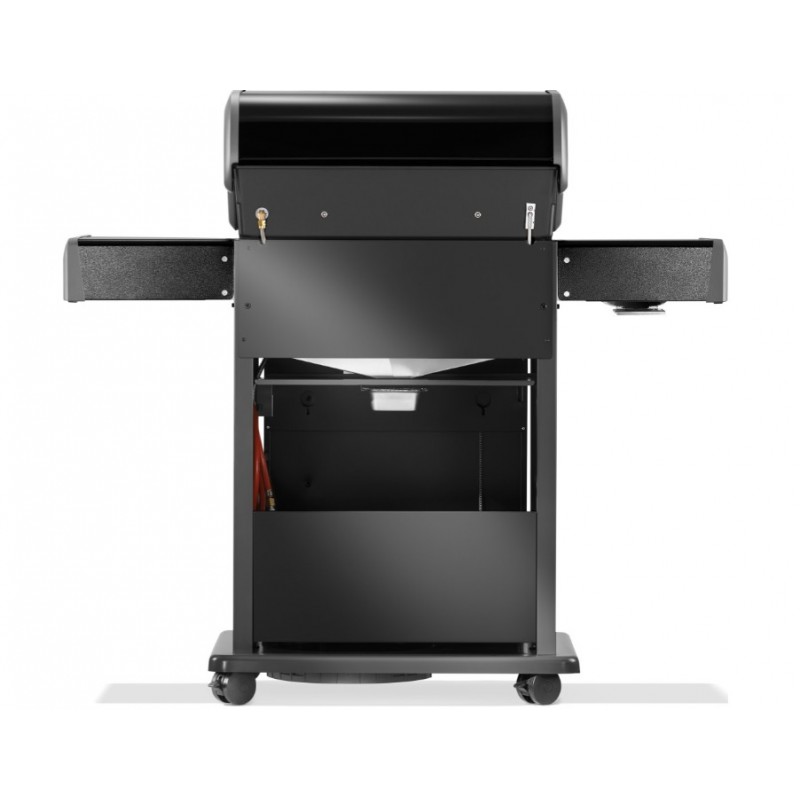The Napoleon Rogue® PRO 425 SIB black barbecue with Infrared equipped with stainless steel grills, a Jetfire ignition and folding side shelves including 1 stove, it allows multiple cooking.