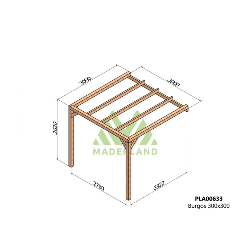 The pergola Burgos is based on 2 poles of 12 x 12 cm with a cross-section providing good stability to the structure and includes beams, also 12 x 12 cm in cross-section, fixed by Wooden brackets.