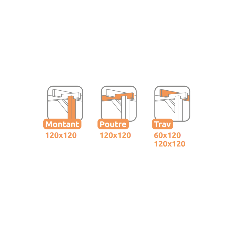 The pergola includes 4 upright posts of 12 x 12 section, load-bearing beams of 12 x 12 and 7 crossbeams of 6 x 12 for excellent strength.