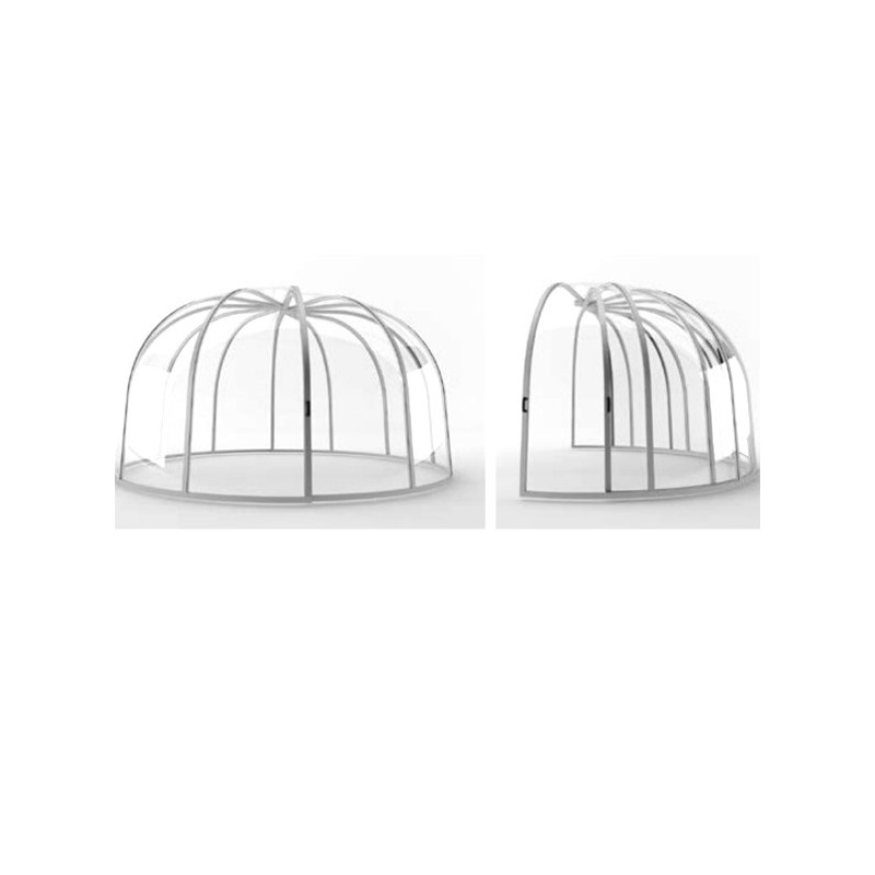 This mobile space with a diameter of 3.74 m and a height of 2.30 m formed by sheets of transparent 3 mm full polycarbonate panels for a panoramic view from your spa.