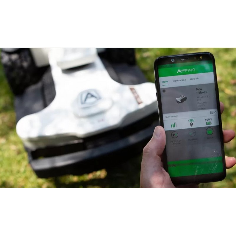 Using the app Ambrogio Remote, it is possible to configure the robot's temporal profiles, check its location (geolocation), isolate and/or work on specific areas of the garden (Go Away), monitor the robot's status and receive alerts when it leaves the garden (Geo fence alarm, an advanced anti-theft system).