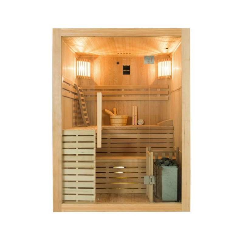 Comes with ergonomic back, headrest and traditional accessories kit (bucket, ladle, thermometer, hygrometer, hourglass)