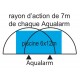Eficaz Aqualarm Le avisa en caso de caída a la piscina y evita que se active involuntariamente debido a perturbaciones ambientales (condiciones climáticas o equipos de servicio como el robot o el sistema de filtración en funcionamiento). Radio de 7 m.