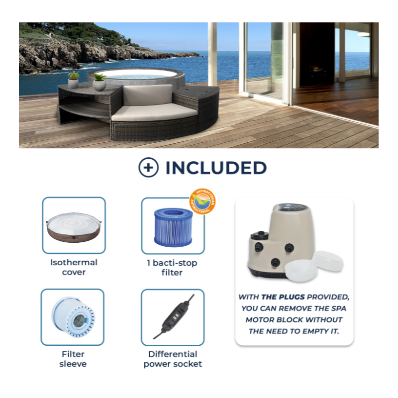 El VITA PREMIUM NetSpa Spa se ofrece en una versión "pack todo incluido" con 5 módulos de mobiliario funcionales y de alta gama.
