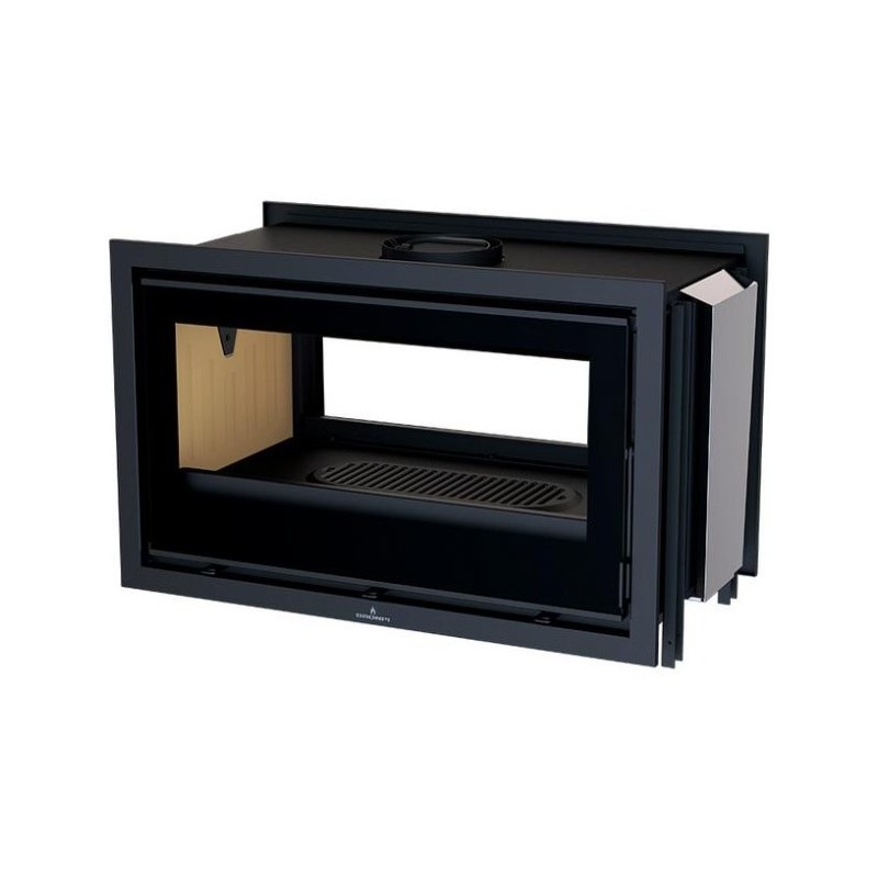 Volumen calentado: 325m3- Eficiencia 80% - Puerta y rejilla de cenicero de hierro fundido - Chimenea de hierro fundido - Doble combustión y sistema de vidrio propio Visón serigrafiado - 4 salidas de aire caliente canalizables.