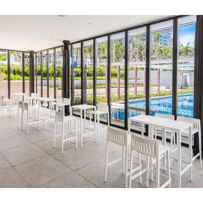 En el lado práctico, los elementos del juego de mesas Spritz y dos taburetes son muy resistentes, ligeros y fáciles de mantener. Muy prácticos, los taburetes también son apilables, para una perfecta optimización de tus espacios.
