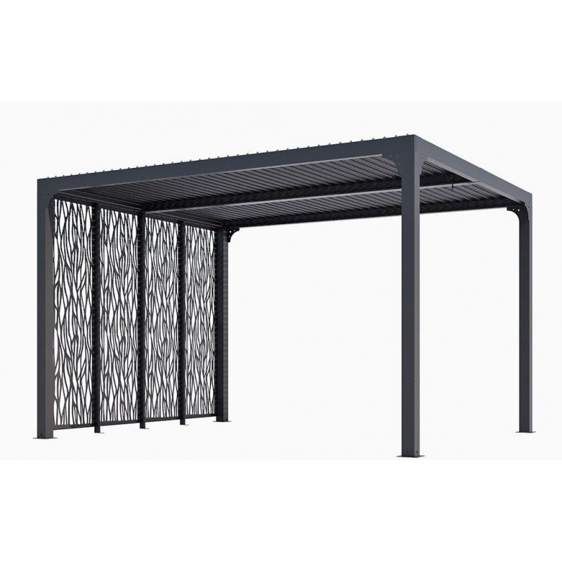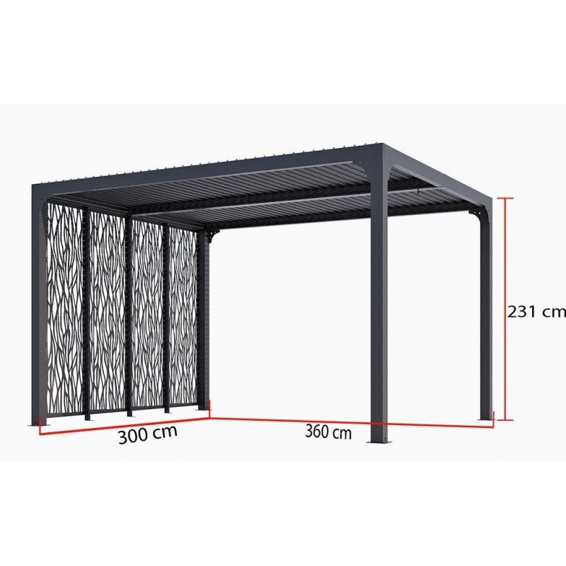 La pérgola tiene 3,60 m de largo y 3,00 m de ancho. Y mide 2,31 m de altura. el el techo consta de 72 cuchillas orientables de aluminio y 5 paneles rompedores de acero de diseño de mosaico, colocados en un lado de 3 m.Sus dimensiones ofrecen una superficie de casi 11 m2 que le permite cubrir un salón jardín de 8 personas, por ejemplo.