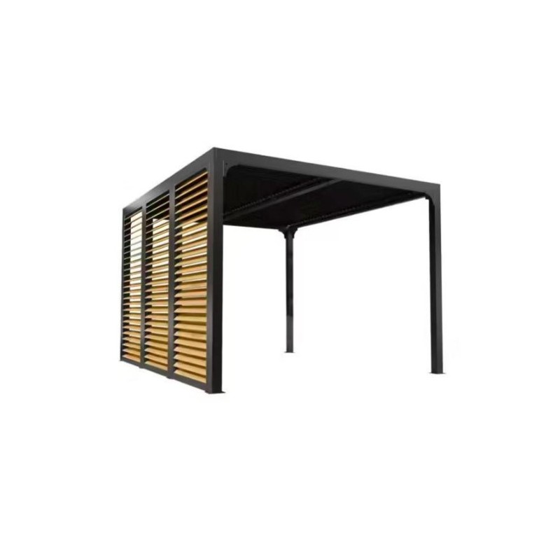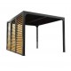 Para optimizar su confort, la pérgola bioclimática está equipada con un conjunto de 2 paneles laterales con lamas extraíbles para uno de los lados de 3 m en imitación madera.