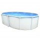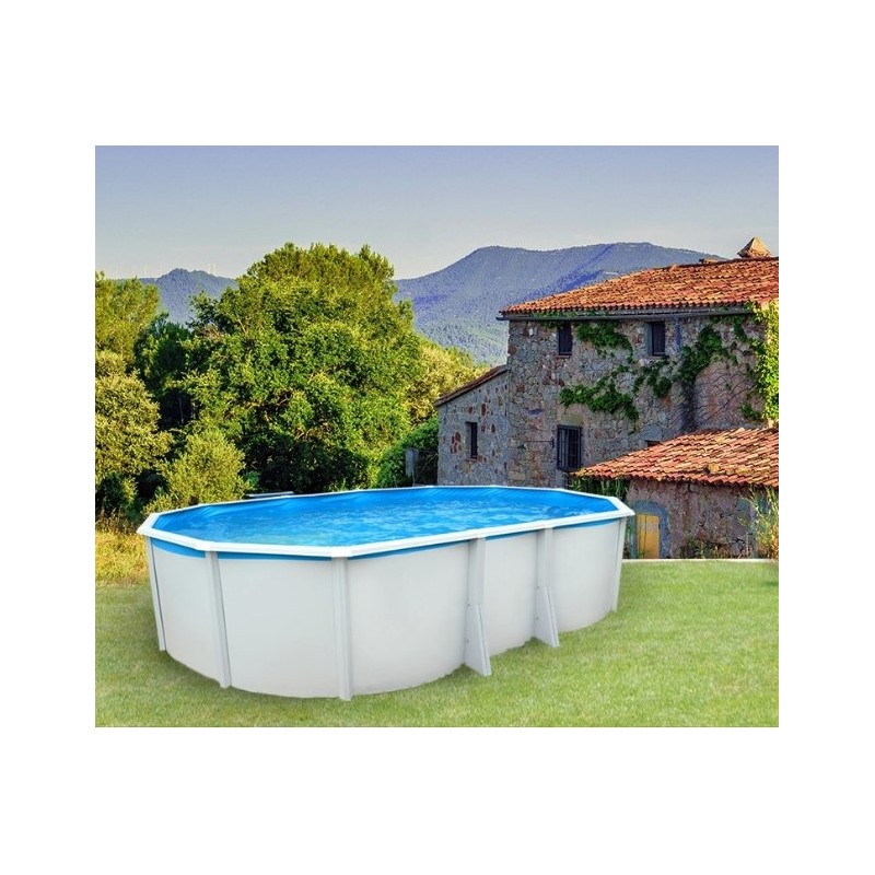 Piscina ovalada de 132 cm de altura sin contrafuertes. La piscina encaja perfectamente en su jardín. Estructura de acero con perfiles metálicos y skimmer completo.