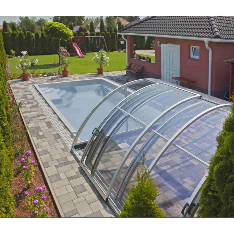 El recinto de la piscina Zen de caña media en forma de arco telescópico con riel a todas las ventajas de una protección de piscina con un diseño cómodo y elegante.