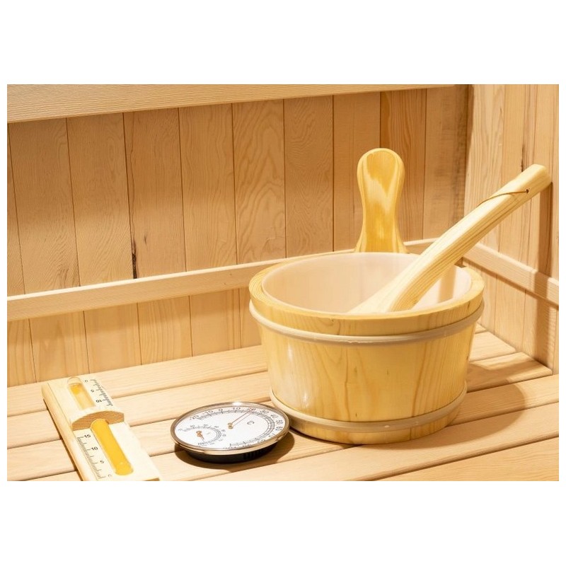 - Kit de accesorios tradicional: cubo con cuchara, termohigrómetro y reloj de arena