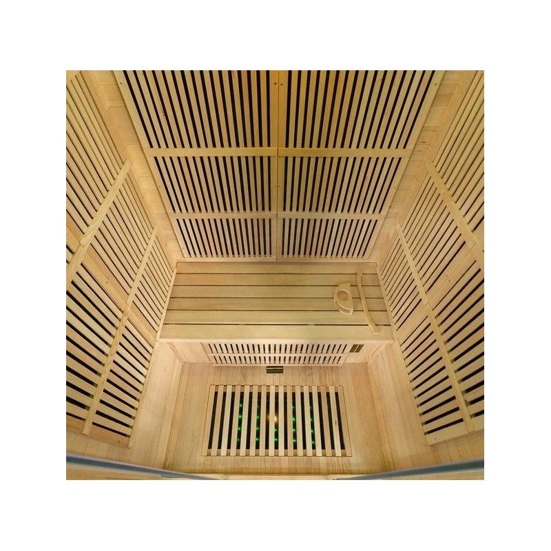 Sauna de infrarrojos VerySpa con tecnología Infrared Dos asientos panorámicos de 2 plazas en madera de abeto para disfrutar de un espacio arrullado por la calidez reconfortante de los paneles cerámicos.