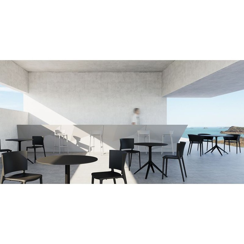 En el lado práctico, la silla Africa es fácilmente maniobrable, ahorra espacio y se puede apilar por 7. Los espacios a cada lado del asiento permiten por un lado la evacuación del agua de lluvia y por otro lado bloquear las sillas utilizando un cable de acero (no proporcionado) durante el almacenamiento al aire libre. Son muchos los activos para esta silla de diseño perfectamente adaptada a un uso particular como profesional, para equipar la terraza o el interior de tus restaurantes, hoteles, cafeterías, Spa, Centro Acuático, etc...