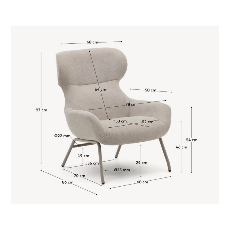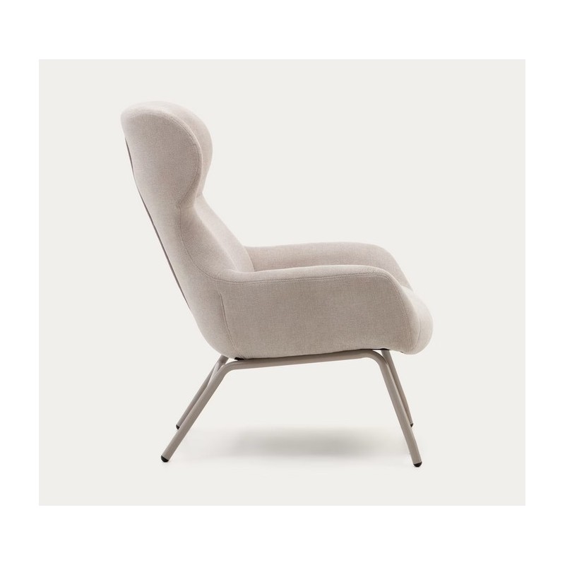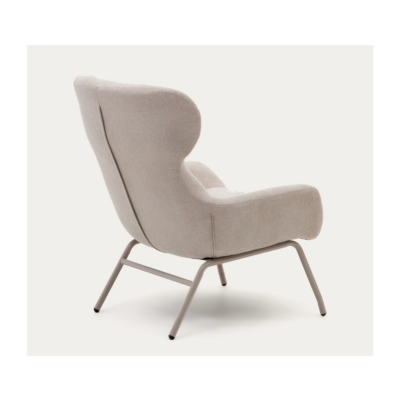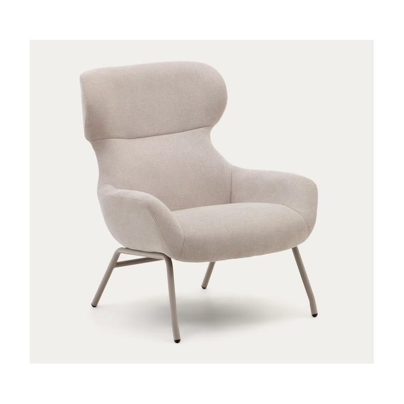 El sillón Lina es la combinación perfecta de confort y diseño, gracias a su tapicería de chenilla beige y patas de acero con acabado en negro.