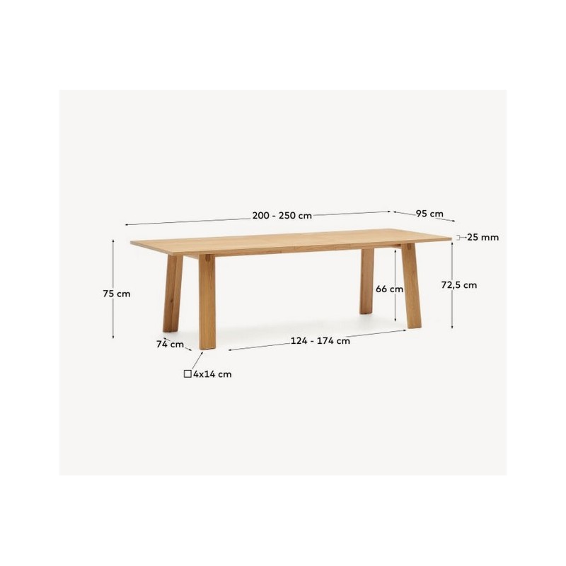 Mesa rectangular extensible con tapa Fabricado en contrachapado de roble y patas de madera maciza con extensiones de hasta 250cm. Acabado en madera natural clara.