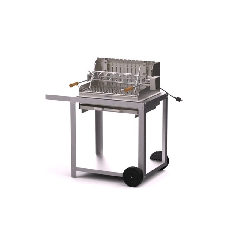 Le Grilloir Mendy en Inox avec Tournebroche 72x51, grille L54xP32 cm réglable sur 3 niveaux avec son Chariot.