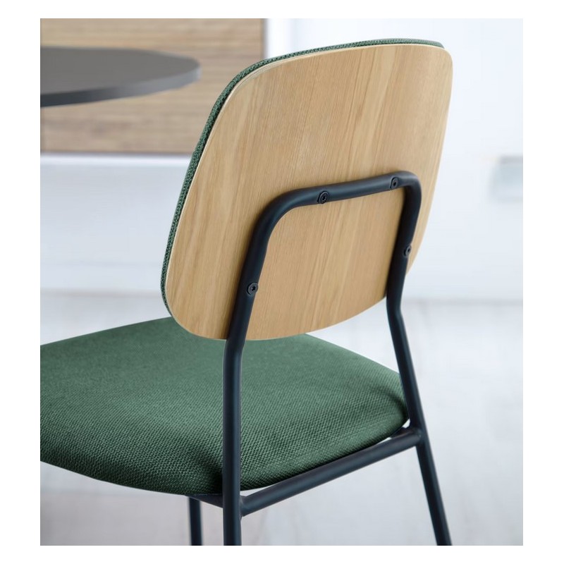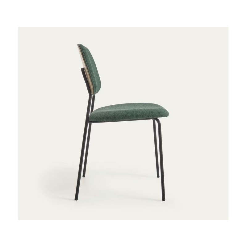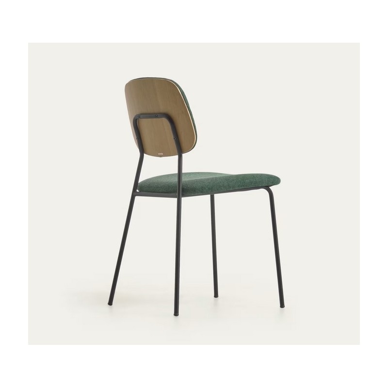 La chaise Linda résolument tendance se caractérise par son style rétro avec son design et à ses matériaux. L’association du placage de chêne et de l’acier est complétée du tissu chenille vert.