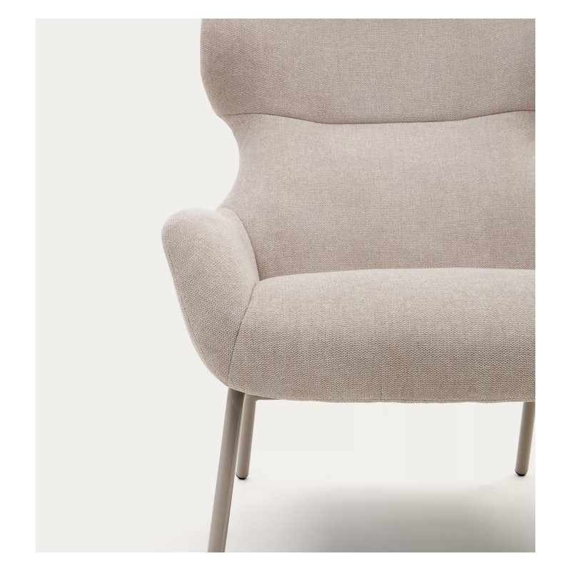 Le fauteuil Lina avec des accoudoirs en tissu chenille beige et pieds en acier noirs.