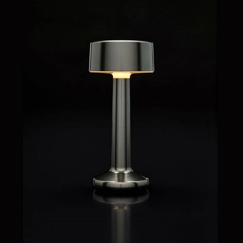 Baladeuse d'extérieur LED rechargeable de la collection Moment éditée par Imagilights, composée d'une structure en aluminium ionisé brossé et d'un abat-jour cylindrique agrémenté d'un diffuseur en polycarbonate opalin.