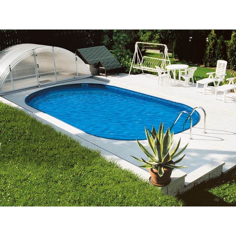 La garantie de haute qualité et de longue durée de vie provient de la construction porteuse de murs en tôle d'acier galvanisé de haute qualité avec une couche de protection contre la corrosion en plastique. Les murs sont revêtus d'un liner de qualité supérieure et durable résistant aux UV et d'une décoration mosaïque très efficace.