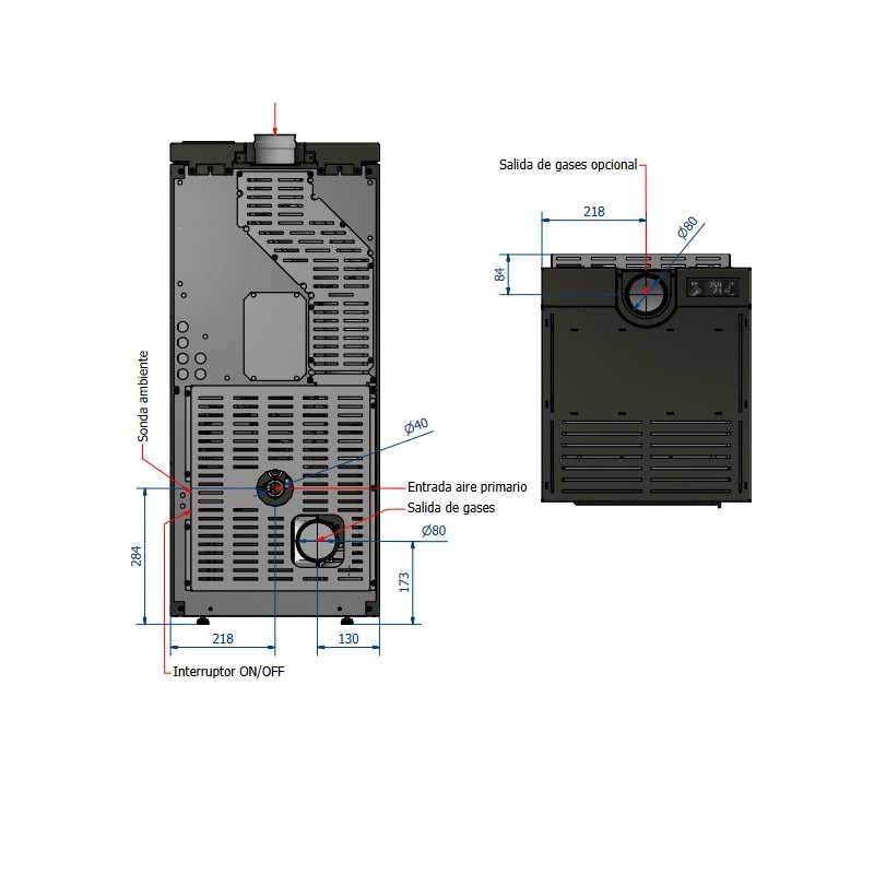 Raccordement des fumées Ø80 mm arrière ou sur le dessus
