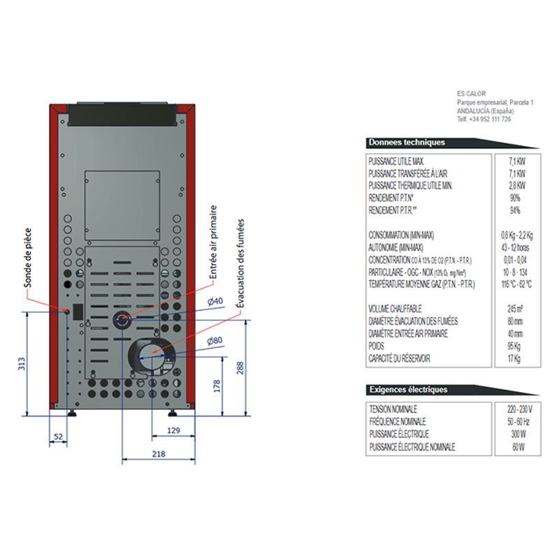 ESCALOR. Puissance 2,8kW à 7,1kW - Rendement max. 94% - Volume de chauffe maxi conseillé 165m3 - Autonomie jusqu'à 28h - Programmateur et télécommande fournie - Capacité 17kg - Affichage numérique - Noir mat.
