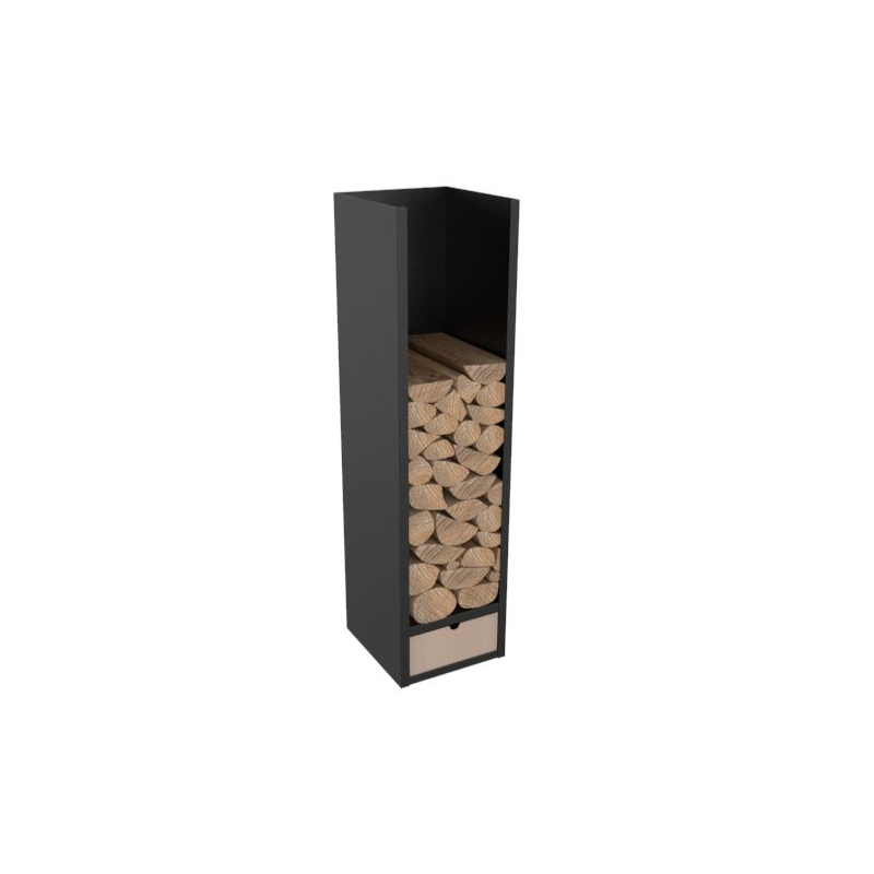 Son tiroir de couleur pierre des sables dissimule les accessoires pour faciliter le rangement des petits accessoires : allumettes, allume-feux, journaux, ou petit bois.