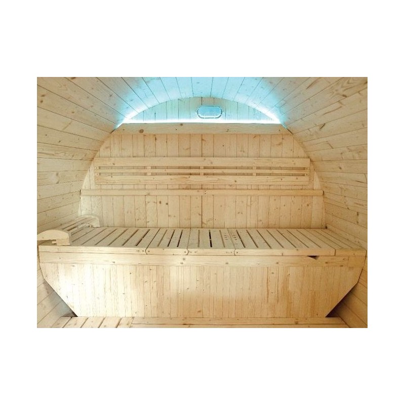 Les vitres surmontées de persiennes apportent du style a la forme ronde de ce sauna d’extérieur. L’ergonomie de la cabine du sauna Gaïa, en forme de tonneau est optimisée avec des banquettes pouvant accueillir jusqu’à 3 personnes assises.