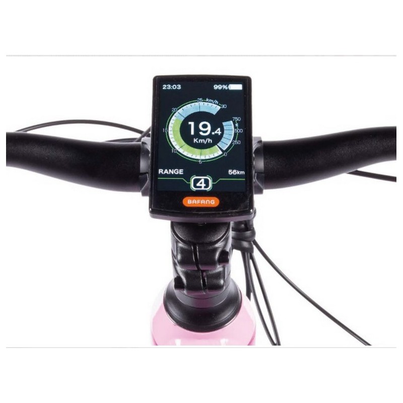 Questa mountain bike elettrica è dotata di un motore Bafang e di una batteria firmata Samsung. Molto potente, questa mountain bike offre cinque modalità di pedalata assistita e un'autonomia media di 200 km.