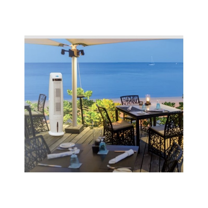 La sua altezza di 170 cm facilita un grande flusso di aria fresca all'interno della terrazza, sotto tende e ombrelloni. Il potente flusso di aria fresca di 3500 m 3/h, è regolabile con un telecomando o direttamente sullo "schermo digitale". È silenzioso e ha una notevole autonomia operativa grazie al suo ampio serbatoio dell'acqua che è dotato di un segnale acustico.