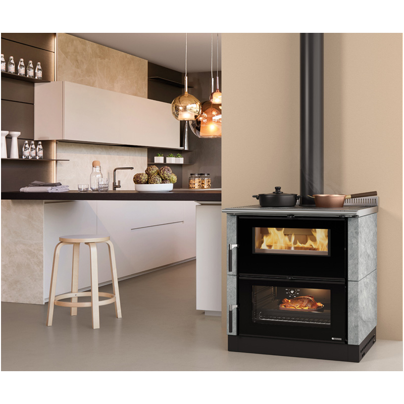 La cucina a legna Verona XXL con forno da 68 litri de La Nordica è realizzata in ghisa con rivestimento in pietra naturale.