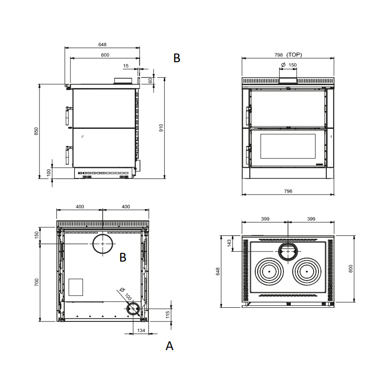 Con una potenza nominale di 7kW che permette di riscaldare circa 200m3. Ampia visuale del fuoco e dei ceppi fino a 30 cm.