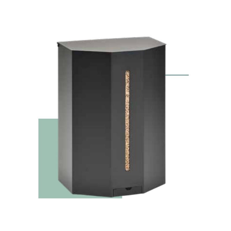 Con la sua forma ispirata ai cristalli naturali, questa riserva di pellet si appoggia a una parete per risparmiare spazio nel soggiorno.