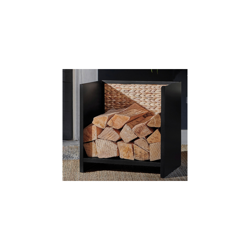 Deposito legna da interno che combina due materiali: la sua struttura in acciaio e il fondo in giacinto d'acqua.