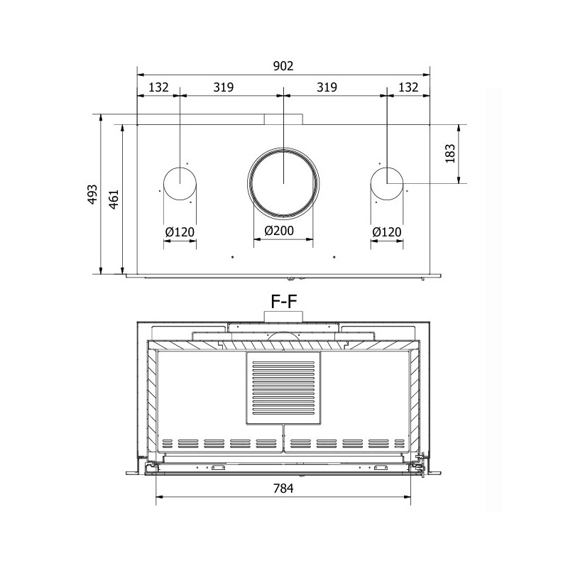 L'inserto in legno F-900 grande dimensioni Ferlux è realizzato in acciaio al carbonio con camera di combustione in vermiculite.